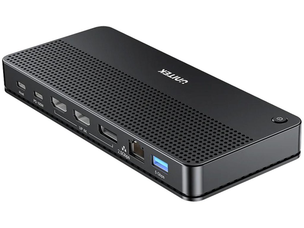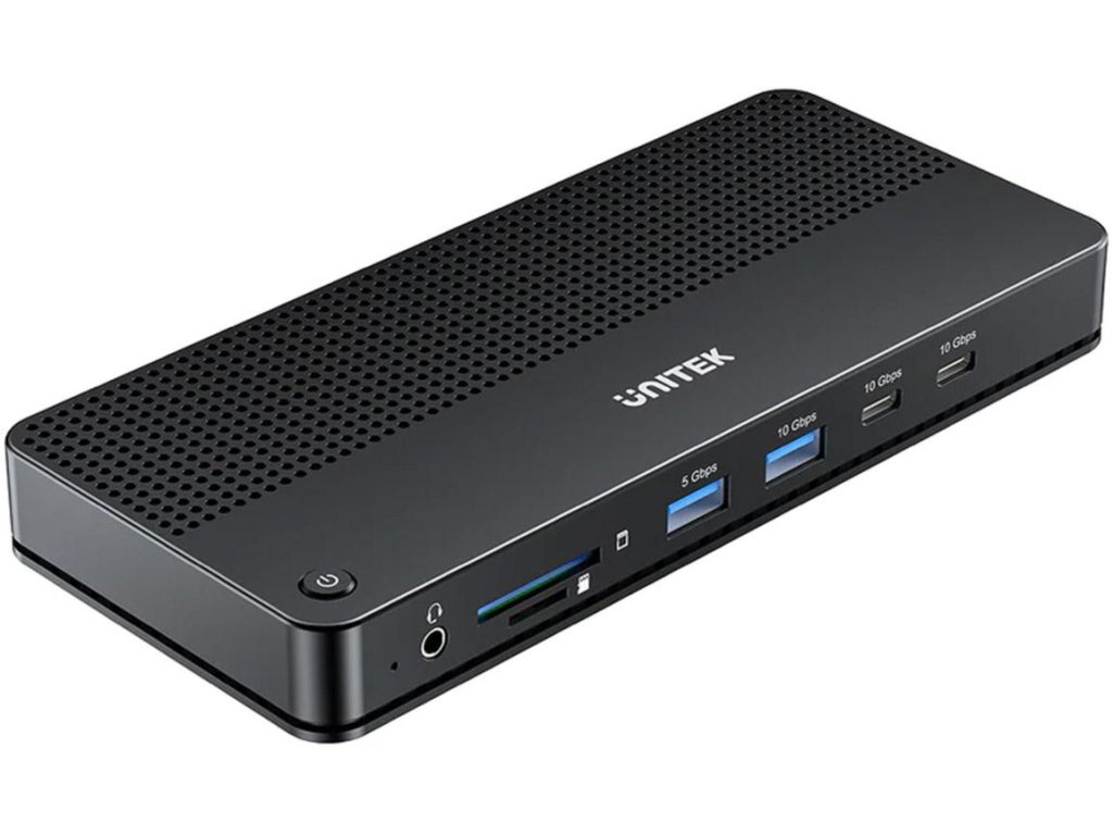 Sloty kart pamięci SD i Micro SD, trzy złącza wideo (2xHDMI i 1xDisplayPort), trzy złącza USB-A, dwa złącza USB-C złącze Jack 3,5 mm oraz Ethernet RJ-45 – stacja dokująca Unitek ma wszystko, czego potrzebujesz, a nawet więcej! Zastosowano w niej w sumie 5 portów USB-C – dwa do ładowania urządzeń, dwa do szybkiego przesyłania danych i ostatnie do podłączenia komputera.