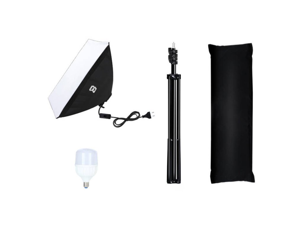 Súprava obsahuje softbox s rozmermi 50 x 70 cm vyrobený z vysokokvalitnej tkaniny so striebornou fóliou spolu s nylonovým bielym tienidlom na zmäkčenie tvrdého svetla a odstránenie tieňov. Softbox sa navyše rýchlo a ľahko rozkladá a skladá a problémom nie je ani jeho skladovanie.