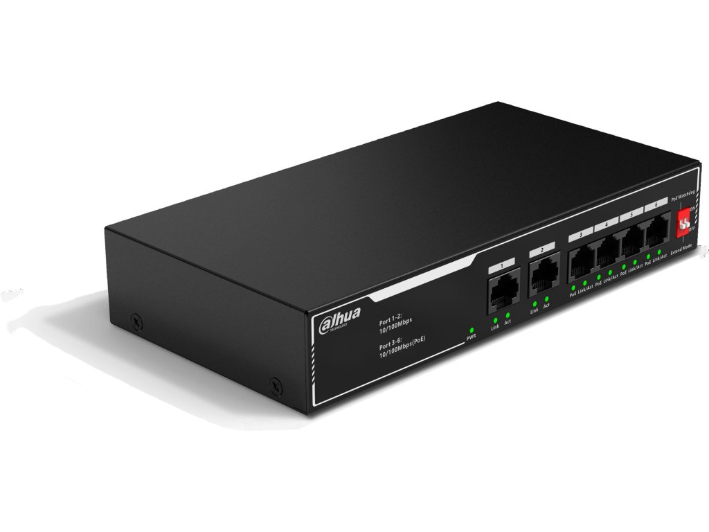 - Wyposażony w 4 porty PoE 10/100 Mbps oraz 2 porty uplink 10/100 Mbps.