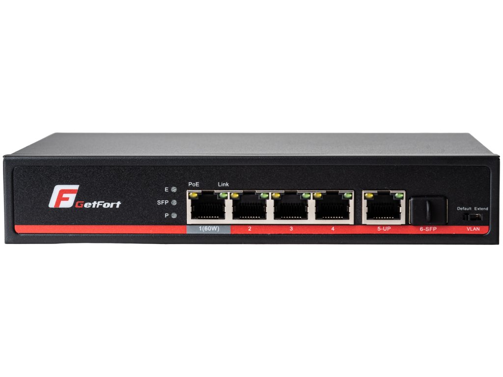 Switch Getfort GF-106-4PG-S-65 to 4-portowy uniwersalny przełącznik PoE Gigabit zaprojektowany do przesyłania danych i zasilania urządzeń, takich jak kamery IP, telefony VoIP, punkty dostępu Wi-Fi, itp.