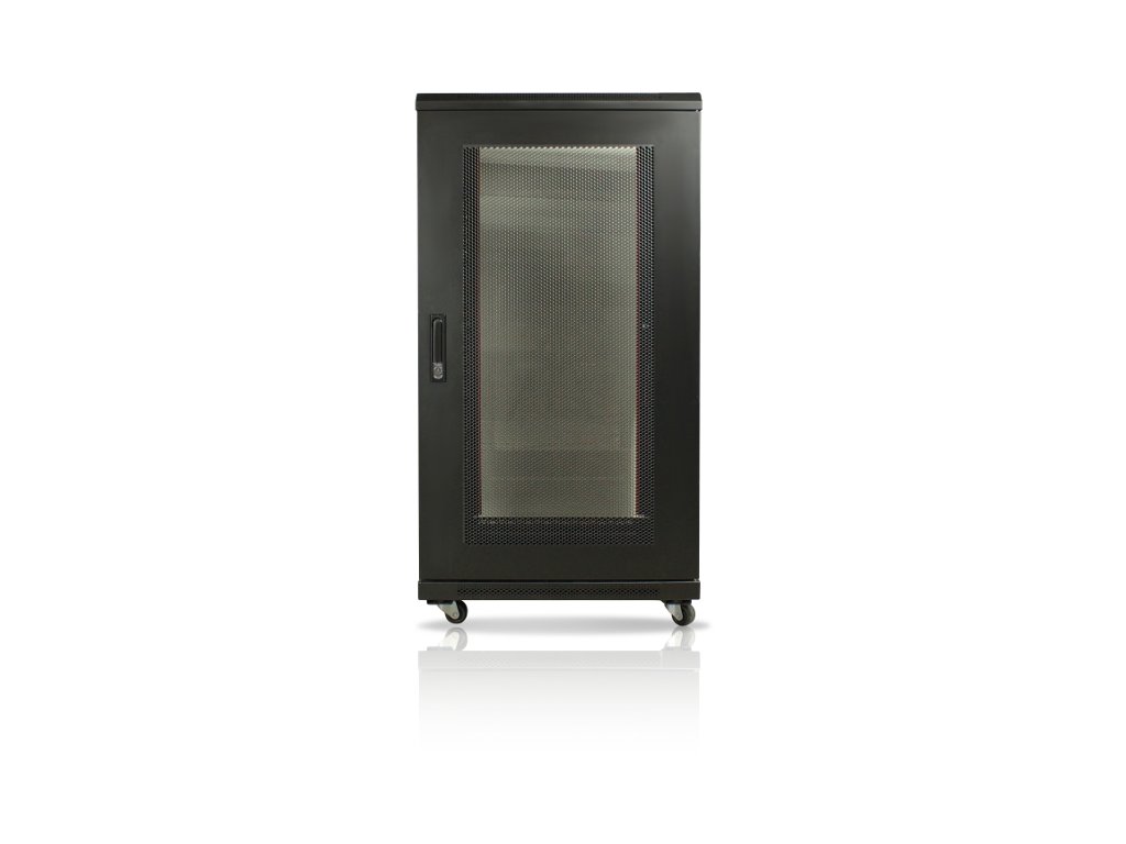 Zastosowanie przednich drzwi perforowanych zapewnia dodatkową, lepszą cyrkulację powietrza wewnątrz szafy. Dzięki temu w znacznym stopniu poprawione zostaje chłodzenie zamontowanych urządzeń i ich żywotność.