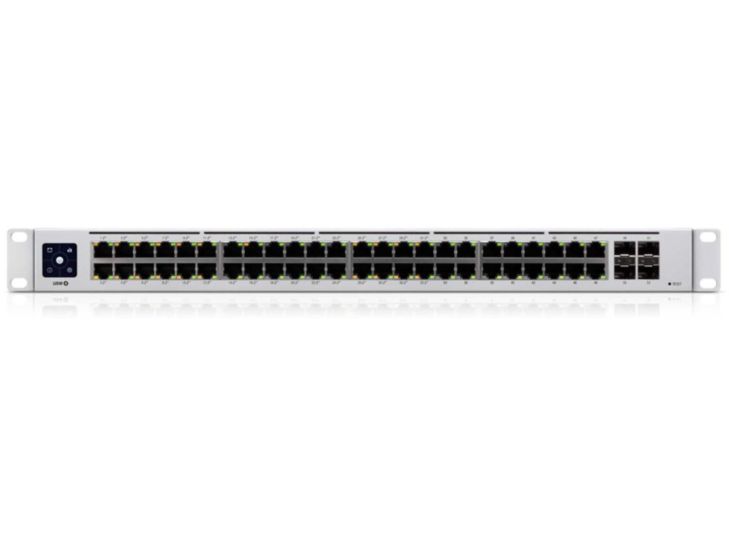 Ubiquiti UniFi Switch 48 POE Gen 2 (USW-48-POE) to zarządzalny gigabitowy switch Layer 2 z 48 portami Gigabit Ethernet, w tym 32 portami automatycznego wykrywania 802.3at PoE+ i czterema portami SFP. Zapewnia łącza Gigabit PoE do urządzeń RJ45 Ethernet oraz połączenia Gigabit fiber uplink do sieci korporacyjnej.