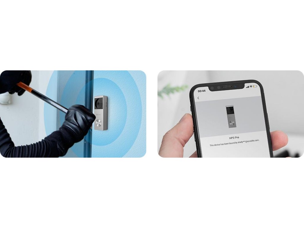 W przypadku próby usunięcia dzwonka siłą, uruchomiony zostanie głośny alarm a Ty dostaniesz natychmiastowe powiadomienie na telefon. Co więcej, po próbie usunięcia HP3 Pro, urządzenie uniemożliwia jego nieautoryzowane użycie dzięki ograniczeniu powiązania konta.