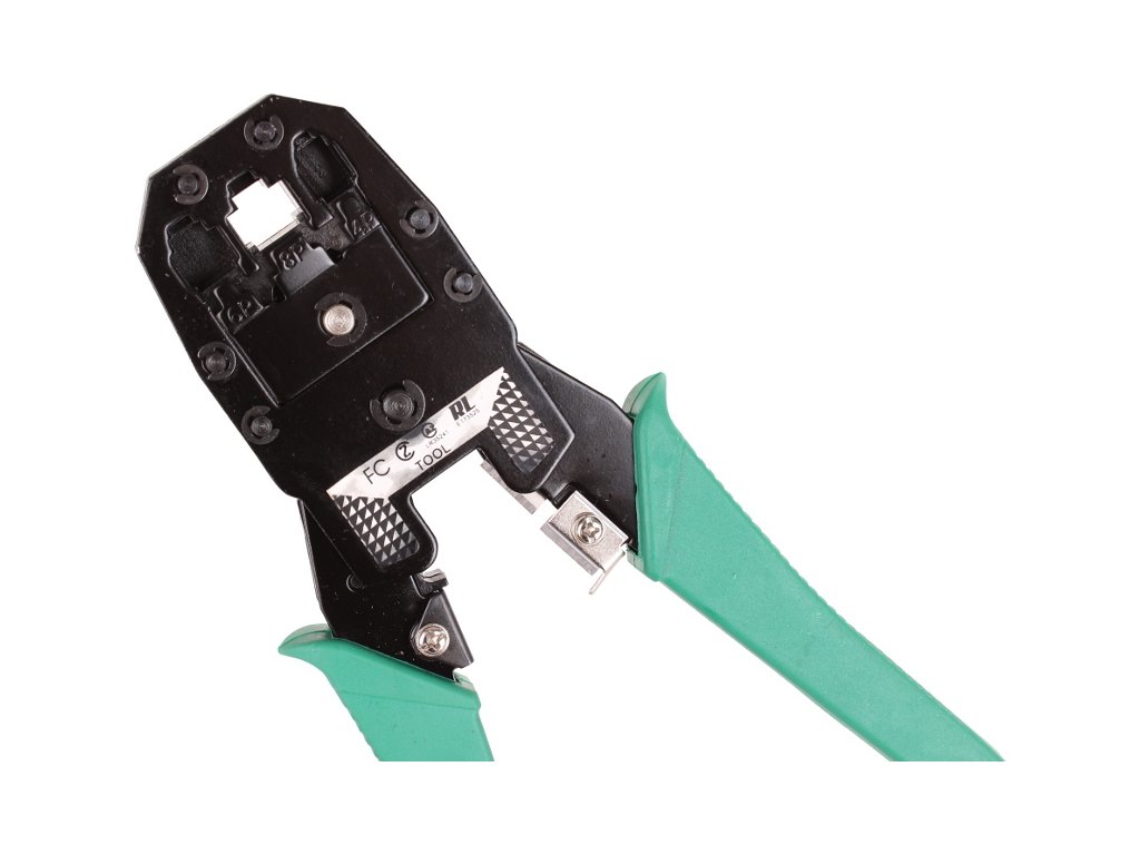 Podwójne narzędzie do przygotowywania i zaciskania wtyków 6 pinowych RJ12 (6p6c), RJ11 (6p4c), (6p2c) i 8 pinowych: RJ45 (8p8c) na końcówkach przewodów telefonicznych. Uniwersalna Zaciskarka niezbędna dla każdego instalatora sieci komputerowych LAN lub telefonicznych, wyposażona w nożyk do obcinania kabla oraz ściągacz izolacji z kabla płaskiego i okrągłego. Posiadając precyzyjne szczęki i układ ich równoległego prowadzenia, mechanizm narzędzia zapewnia dobrą jakość montażu. Narzędzie wykonane jest ze stali z czarną powłoką antykorozyjną i posiada ergonomiczne plastikowe nakładki. Długość całkowita: 190 mm. Wykonana z hartowanej czarnej stali