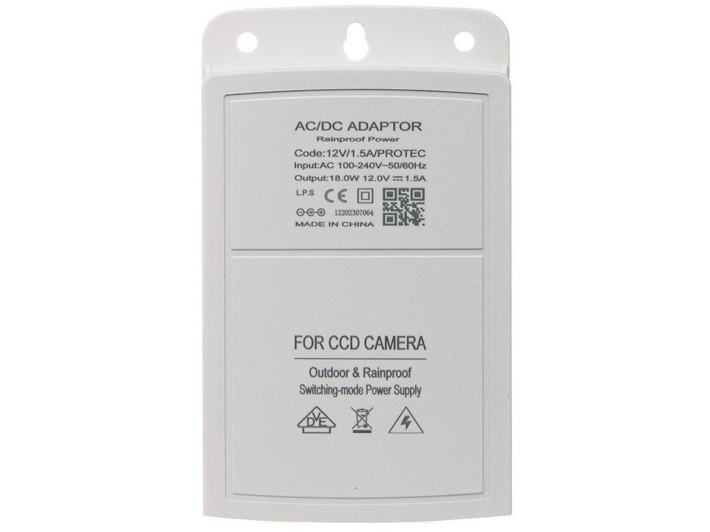 Zasilacz impulsowy firmy Protec w estetycznej bryzgoszczelnej obudowie. Przystosowany do montażu zewnętrznego na murze (dla IP53 zalecany jest montaż pod zadaszeniem). Złącze zasilania kamery i wizji mieści się bez problemu wewnątrz obudowy zasilacza. Poprawny montaż zasilacza możliwy jedynie w pozycji pionowej, złączami do dołu.
