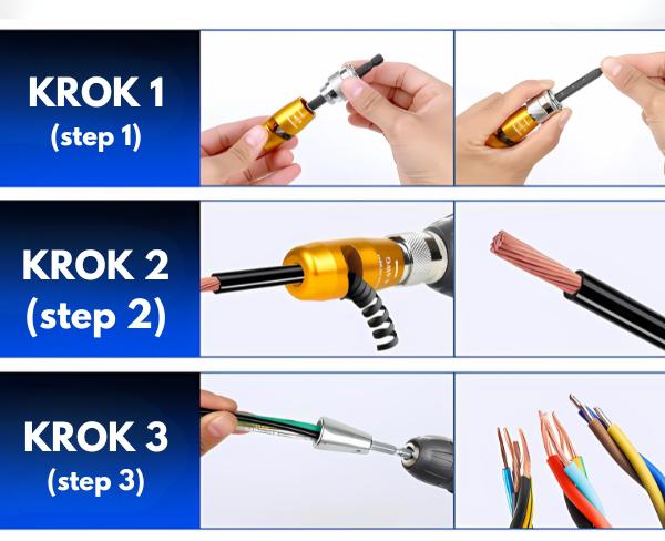 HT-EK4-2 to praktyczne narzędzie do szybkiego i precyzyjnego zdejmowania izolacji z przewodów. Wystarczy podłączyć ściągacz do wiertarki lub wkrętarki, by w kilka sekund przygotować końcówki kabli do dalszej obróbki. Idealne rozwiązanie dla elektryków, majsterkowiczów i instalatorów.