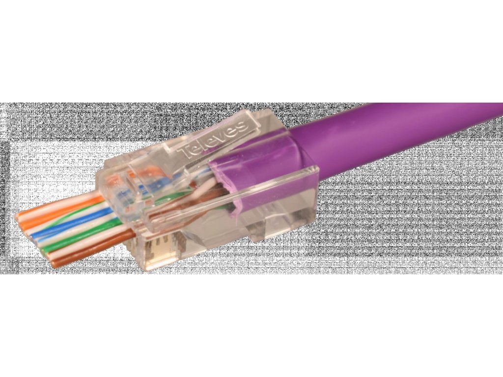 Przelotowe złącze męskie RJ45 UTP Cat 6 do kabli danych. System typu pass-through zapewnia wygodę i niezawodność podczas podłączania kabla. Pary żył wkłada się do samego końca, upewniając się, że wszystkie sięgają zakończenia złącza, a następnie odcina się nadmiar. Dzięki temu pary stykają się ze stykami, a złącze jest dokładnie założone.